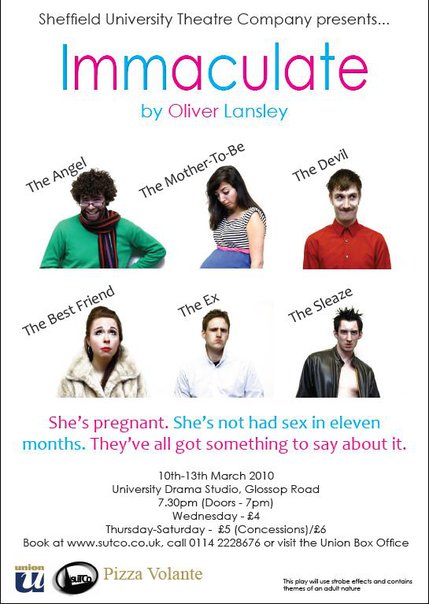 One of my friends (and the official Spammer of Sloucher), called me on Thursday. Besides telling me of a girl he hooked up with at Northern Soul (the kebab joint in Fulwood – tell them Quinto sent ya!), he was ranting and raving about Immaculate, a play in Sheffield University’s Drama Studio.