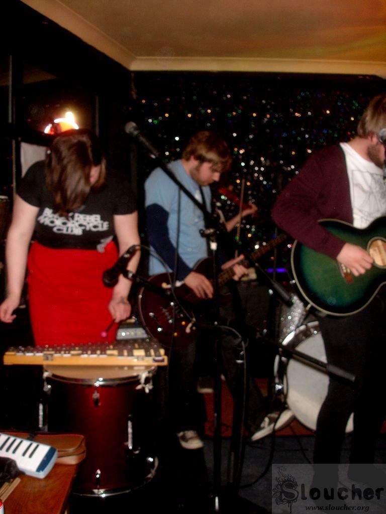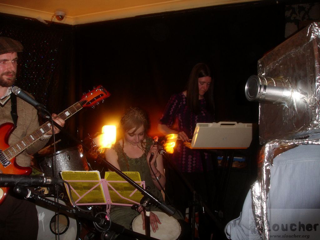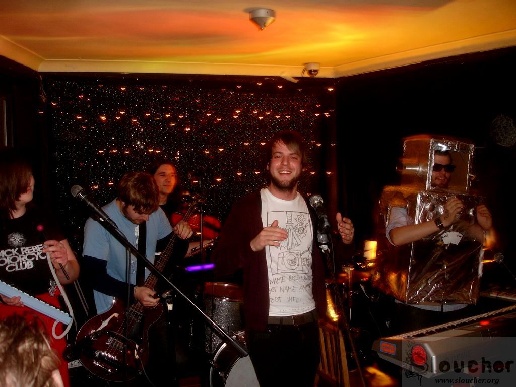 Damned if I knew, but then a band took the stage. A girl manning (womaning? Personing? Argh!) playing a floor tom (and some self-described “twee things” or so dixit their facebook), a violinist, a bassist, a guitarist/singer and a robot.