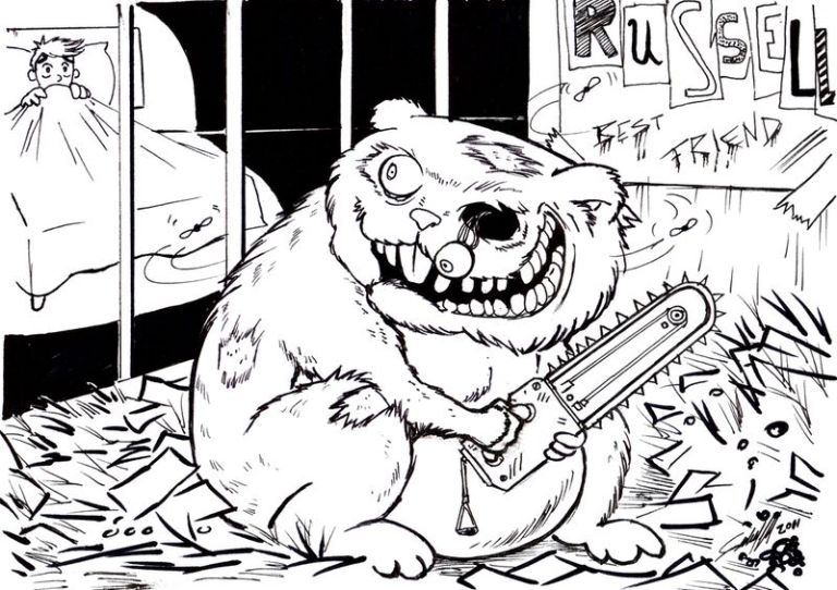 A couple of months later, Russ had taken to hiding under the sheets every night to avoid Smiley’s constant gaze. Every night he would have the same nightmare of waking to find Smiley on his chest, and looking behind him to see his family all tied up and gagged in the corner, he’d usually wake in a cold sweat by the time Smiley produced a tiny chainsaw and said: