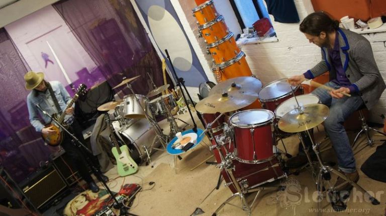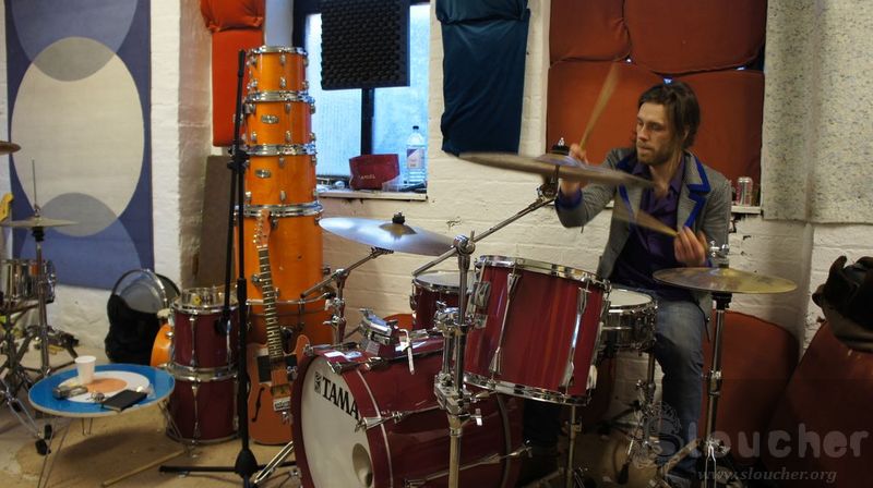 Still, the place is cozy. Thomas offers some instant coffee while Nick sits behind the drumkit and does some drumming to keep warm.