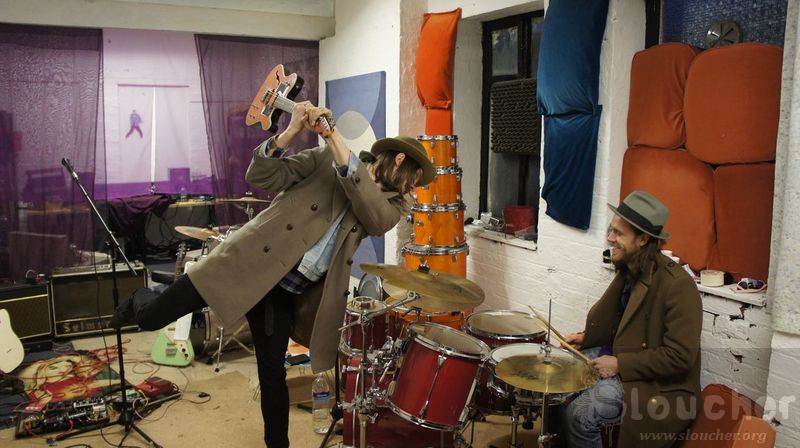 They are Death Rays of Ardilla, and Thomas and Nick are brothers, well armed with guitars, pedals, valve amplifiers and a drumkit. While the kettle is working, Thomas shows us one of his guitars. It’s a little knackered and he regrets the neck bit being curved up now.