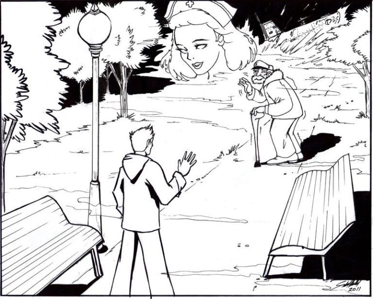 Footsteps and breath, far away but approaching. They had to belong to a villain. Who else would be out at this hour? Russ didn’t even raise his head to look, let it be a surprise. The breather joined Russ on the bench, and in an out-of-breath German accent wheezed: