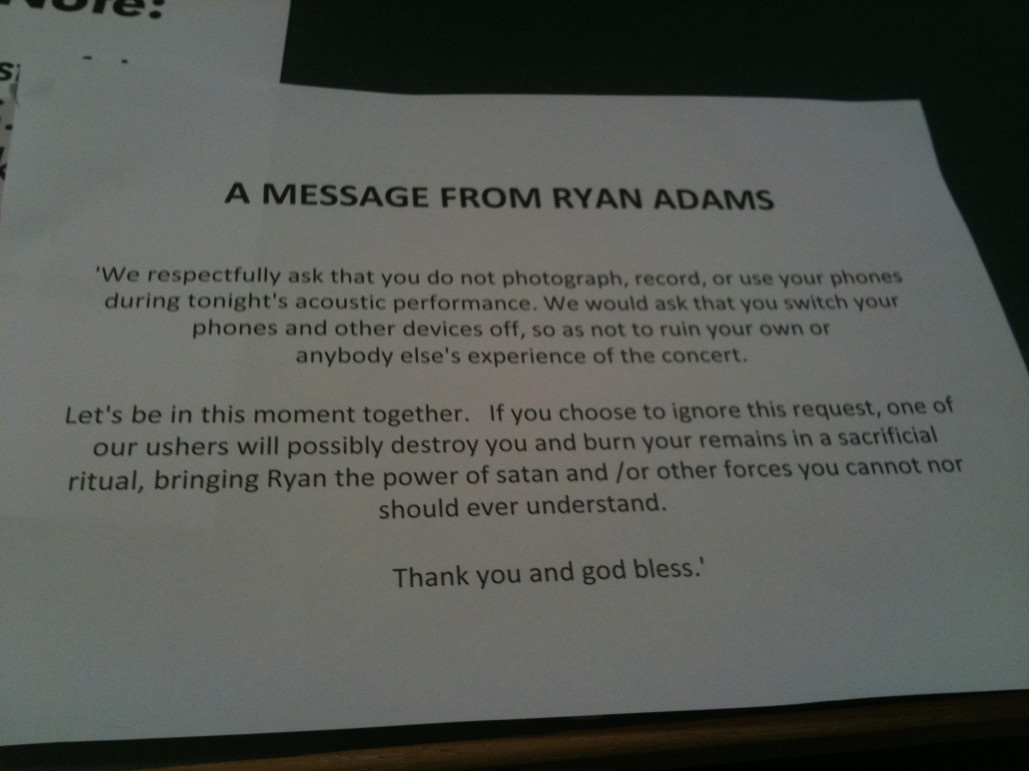 On to the main event: a somewhat muted Mr Adams comes on stage to raucous applause from the seated audience, he’s quiet and it seems as if he’s in a bad mood as he launches into his first song (I don’t remember what that was, helpfully). One thing that is clear from the off is that Adams has one of those voices which sounds even better live than on record, with a wonderful tone to it, all of which creates a totally commanding stage presence.