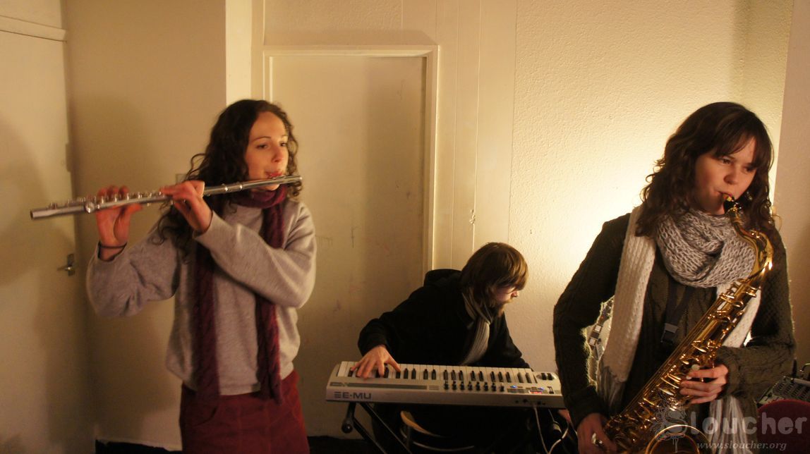 It’s the Legend of 7 Black Tentacles and a small discussion about one of them being called a “BFF” in a previous interview for this website rages on. I am reminded this is off the record. I think it’s a joke, but I then see a laser sight on my chest. So it goes. They are Ben (cello), Hannah (sax), Sarah (vocals/flute), Gordon (keys/samples/field recordings), Andrew (MC) and Tim  (drums).