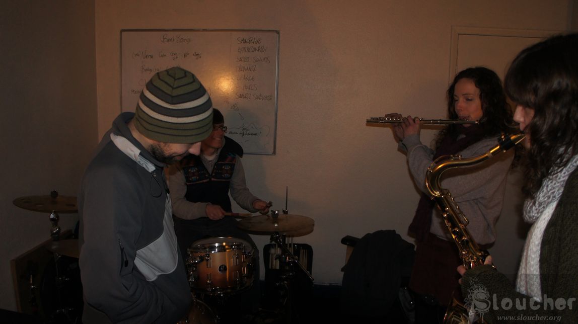 Picture this: a small cramped practise room in the heart of (well, near one of the football stadiums, dunno which team). 6 musicians, all from very different backgrounds. Not a single guitarist in sight (well, there’s one but he is not playing guitar) and a bass player that was AWOL, saving the world from the evil forces of Pitchfork and Robert Christgau.