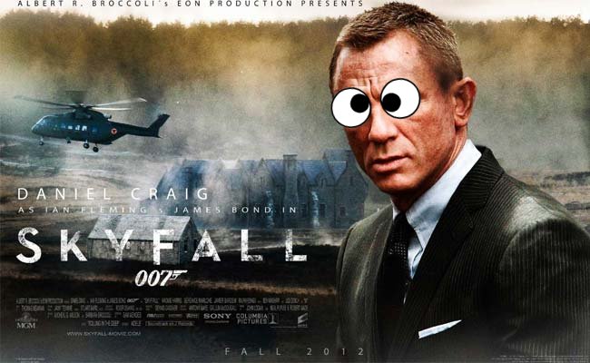 Oh, vicarious vicissitude of vicious vile villagers, woe is me! So the movie (downgraded from film) starts with quite the cold opening (Bond wounded in the water, you know, like the beginning of The Bourne Identity – ZING!) and some time passes, M looks forlorn, pets her little Churchill figurine (oh, yeshh!) and a lot of yakkety stuff happens. I dunno, I was eating popcorn. My popcorn was more interesting than this flick (downgraded from movie).