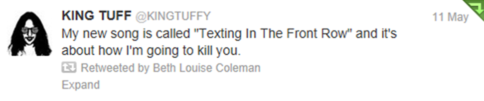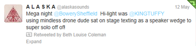 King Tuff lept upon the turncoat, stradled him and played an almighty (and perfectly timed) shredding guitar solo to the crowds praise. Nothing is more pleasing to the crowds than using a peasant as a footstool during your perfomance. It was great stagemanship to see Tuff keep a cool head and use it to his advantage, same kudos to Alaska for brilliant crowd interaction – and then leaving it to Twitter to laugh about it afterwards:
