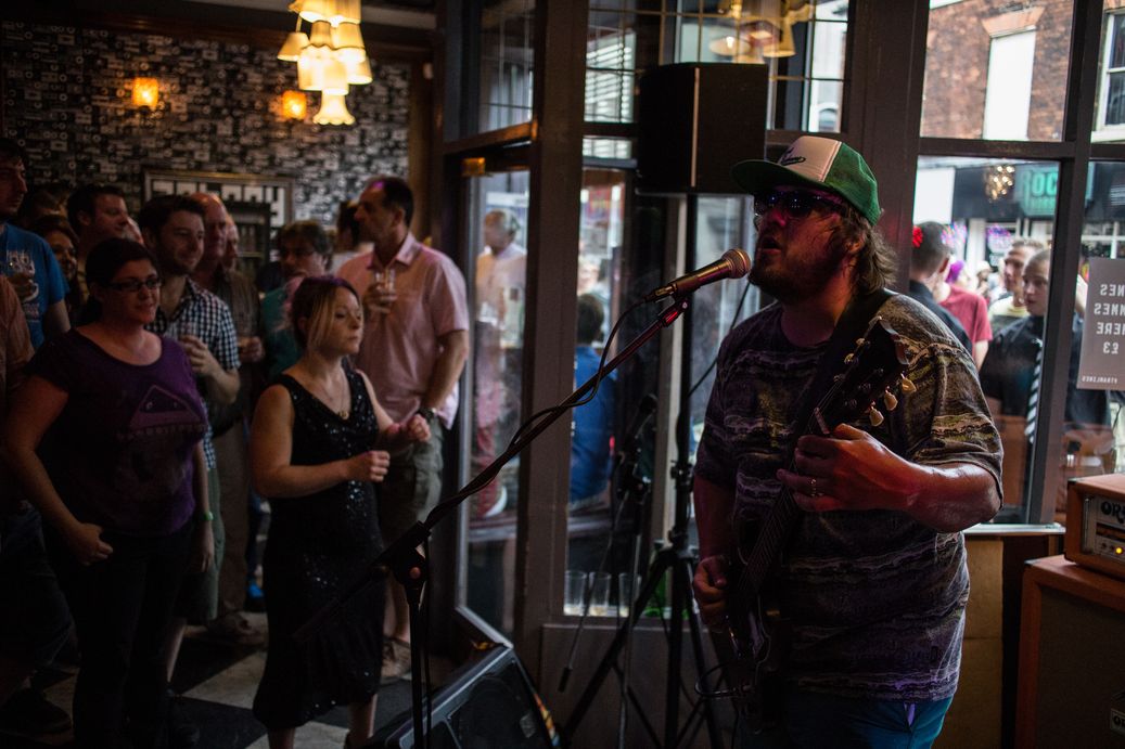 I happened to get there early, and caught a bit of the previous act. It was nice – apart from losing a couple of buttons squeezing in amongst the bodies. But next to the sound desk a young fella with an acoustic guitar was playing a cheery form of skiffle. People seemed to like it.
