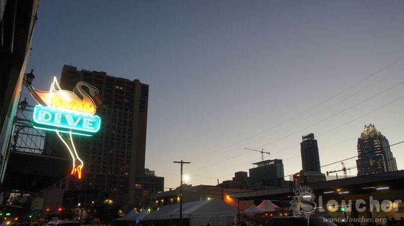 I pander my inner child by taking a photo of some graffiti shaped like ALF. I’m pretty sure that show fueled my lifelong depression, but let’s not get lost into specifics (or novel plot twists), eh? I check my twitter mentions again and the Music Bazaar people are at the Swan Dive. I make my way there, watching human stupidity at its worst: an ambulance is blasting its horns, making its way to the I-35 and people cross the street without even looking or caring. Goddammit, let the fucking thing pass!