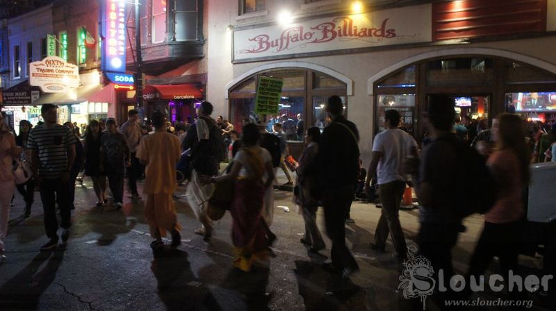 Buffalo Billiards is a funky place. There’s a crowd for every single stereotype you could imagine. Rockers, greasers, rappers, locals, people on the prowl and dim-witted tourists. I probably fit in one of those categories. Heck, with my girth I probably occupy a few of them. Whoa, a fat joke, cool it with the self-pity, man. When I finish my ale (it was a very comfy sofa), I walk out and hear some chanting. It’s a group of Hare Krishnas, making their way through the 6th street crowd. I want to yell “GOURANGA!” but again, it’s lent and I should cool it with both the obscure references and the self-pity.