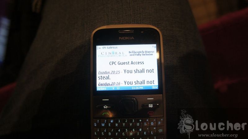 Right, I move another couple of rows forward. I’m on row 3 and plan to move to row 2 when this woman sits on row 2. She looks frighteningly familiar. I bid my time. I wonder for a minute if this church has wi fi. Lo and behold, there’s several networks available. One is called “Pope Francis, U there?”, but it’s password protected. The Presbyterian Church’s, however, isn’t. I get this warning.