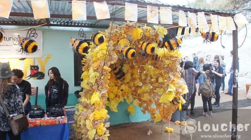 The Wild Honey Pie have really taken over Cheer up Charlie’s. Bear-shaped honey bottles spray painted in gold, paper bees, chile-shaped fairy lights, a big paper honey comb, yellow plastic cups and enough paraphernalia to make people think of Nicolas Cage and Macaulay Culkin meeting their demise in films that are cult for the wrong reasons. Two photos: