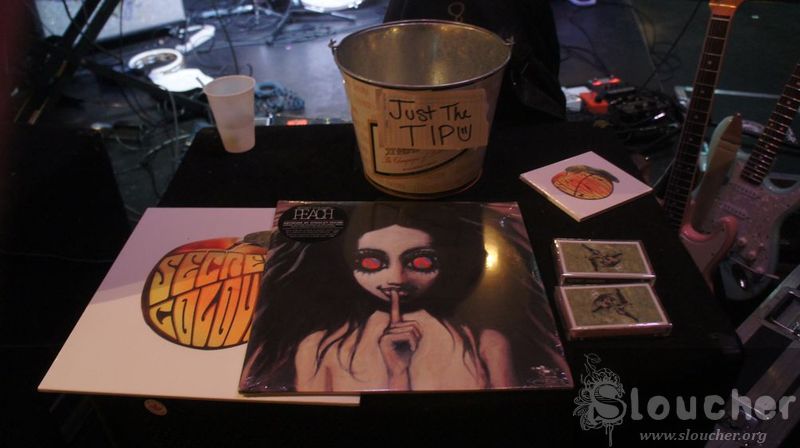 There’s a bucket that says “Just The Tip” by one of the amps. I throw a couple of quarters inside and wonder where it will end. Secret Colours set up their gear and one of them puts their merch on said amp, surrounding the bucket.