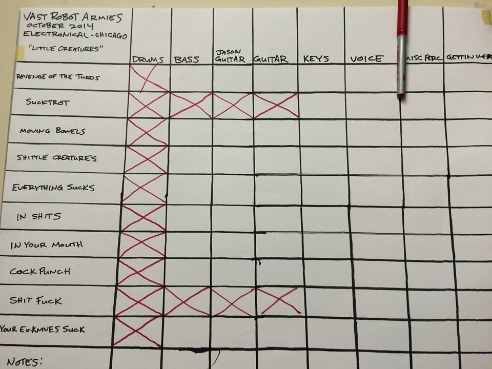 4. The guys enjoy fucking with your song titles on the whiteboard flow chart in the Control Room. This being my 3rd album with them, it has become a ritual, each album song chart is expected to top the previous. So far there is a Cal Ripken’esque streak going on.